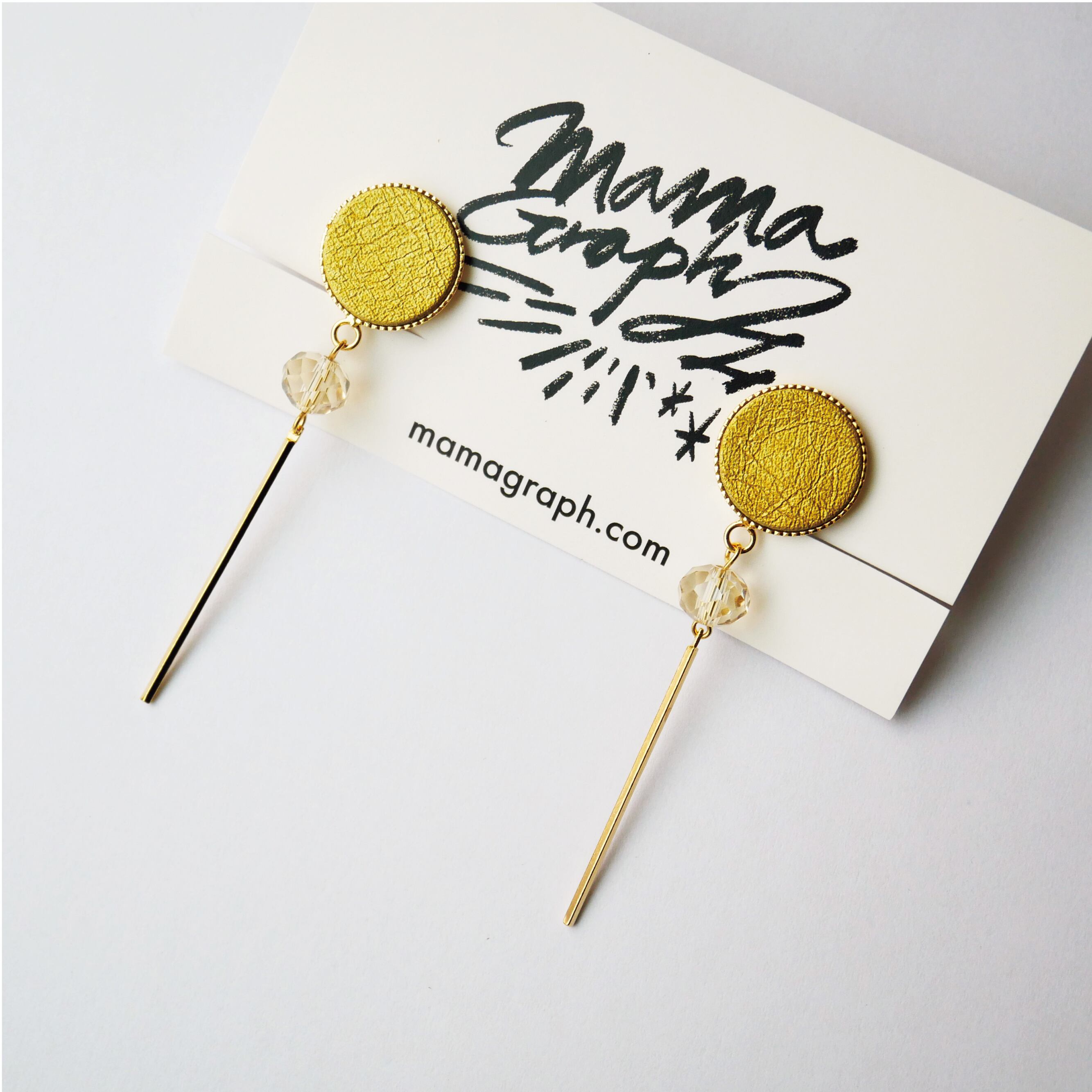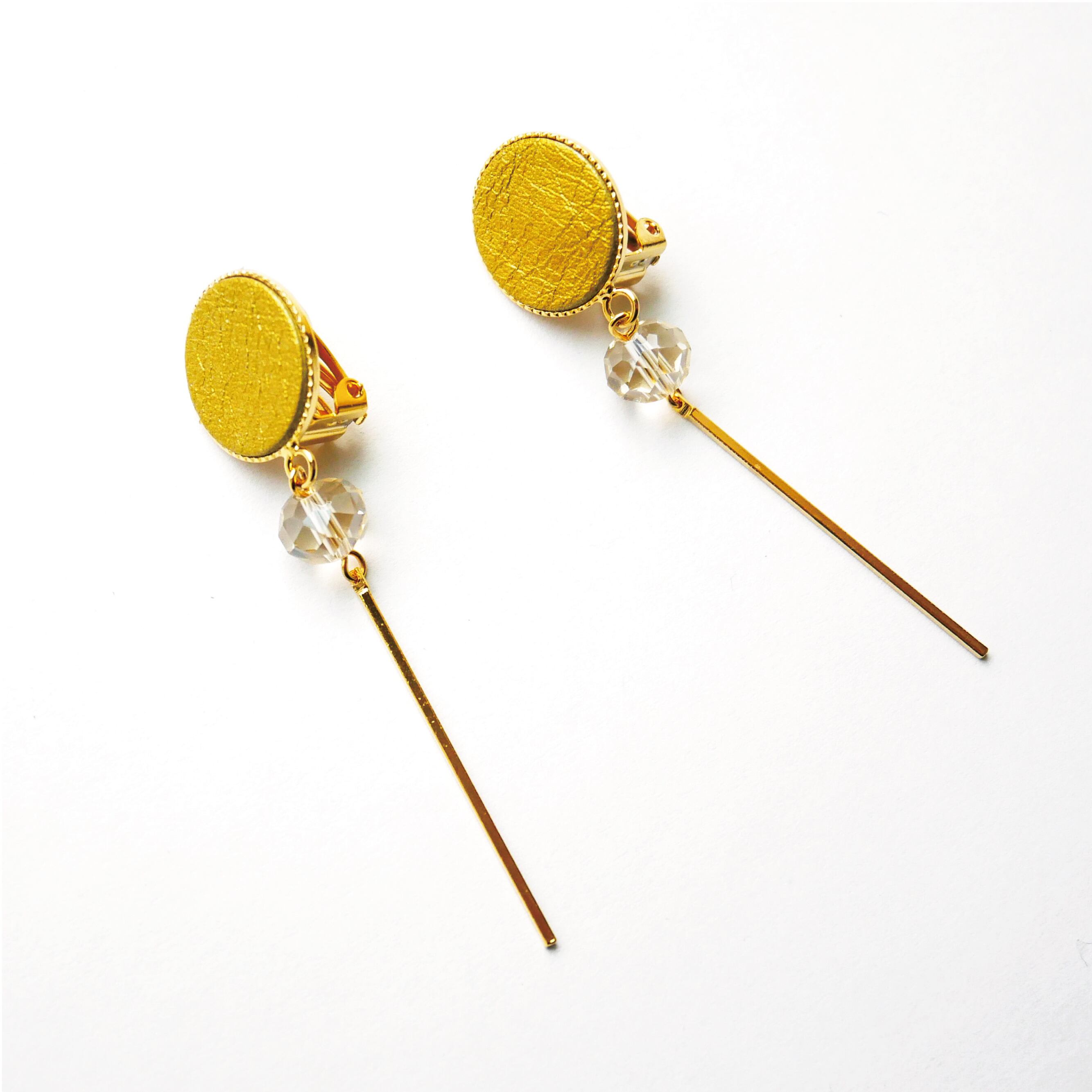 ゴールドレザーにカットクリアビーズとシャープなゴールドバーをあわせたピアスです。