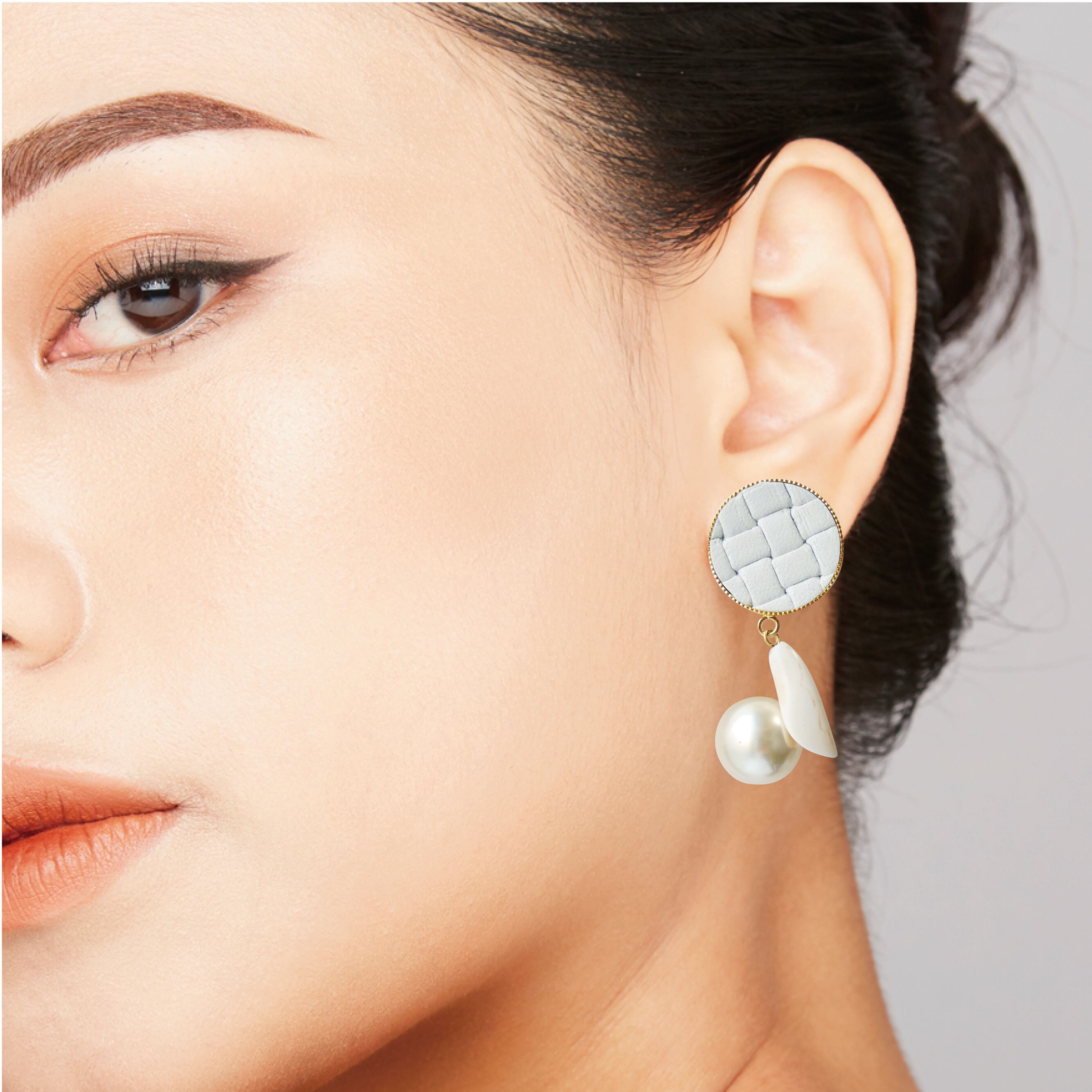 型押しホワイトレザーにパールとホワイトターコイズをあわせたピアス/イヤリングです。