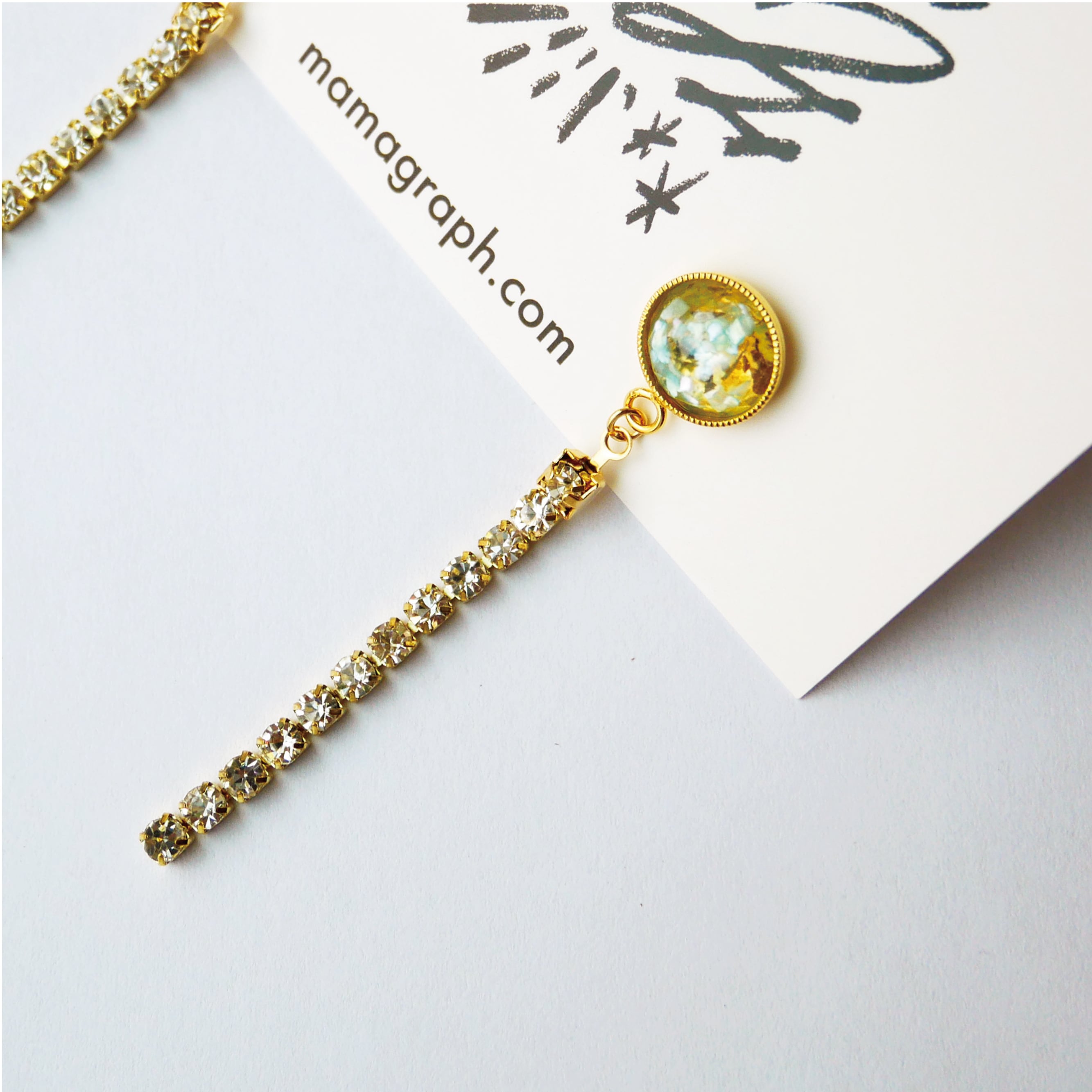 水色と金の優しい色合いのパーツに長めのラインストーンチェーンをあしらったピアスです。