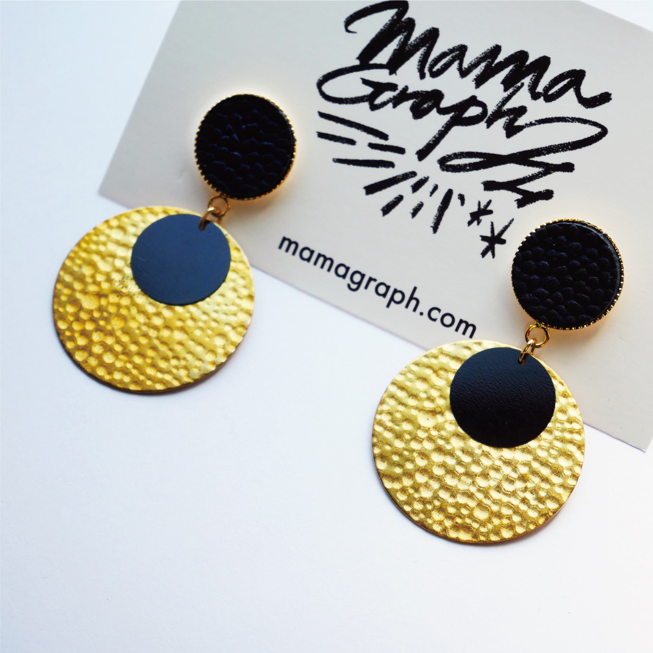 #021 ブラックレザーと大ぶりラウンドプレートのピアス/イヤリング